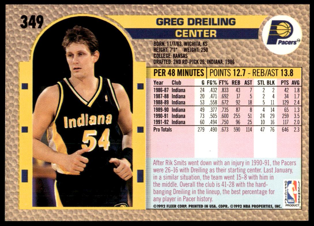 This Basketball card, from 1992-93 is part of the Fleer  card set. Greg Dreiling is featured and has a card number of 349.