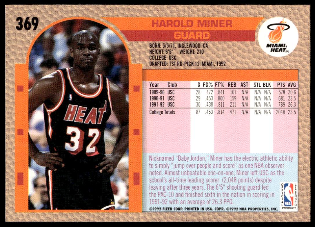 This Basketball card, from 1992-93 is part of the Fleer  card set. Harold Miner is featured and has a card number of 293.