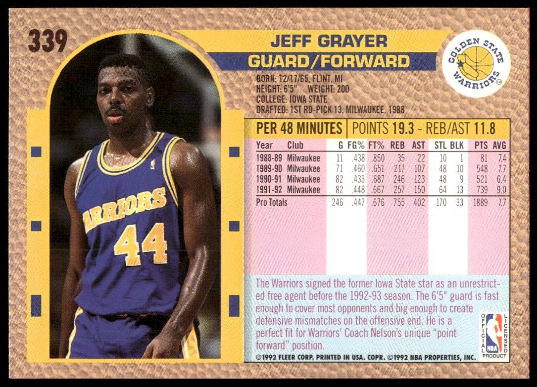 This Basketball card, from 1992-93 is part of the Fleer  card set. Jeff Grayer is featured and has a card number of 339.