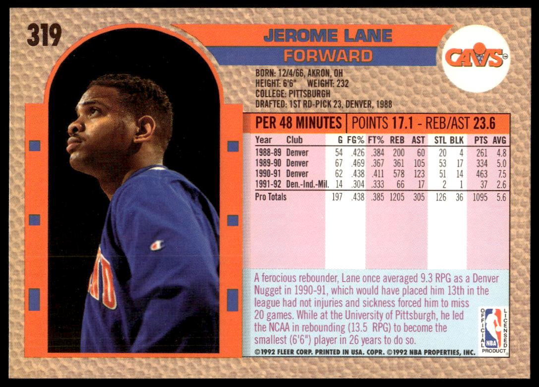 This Basketball card, from 1992-93 is part of the Fleer  card set. Jerome Lane is featured and has a card number of 319.