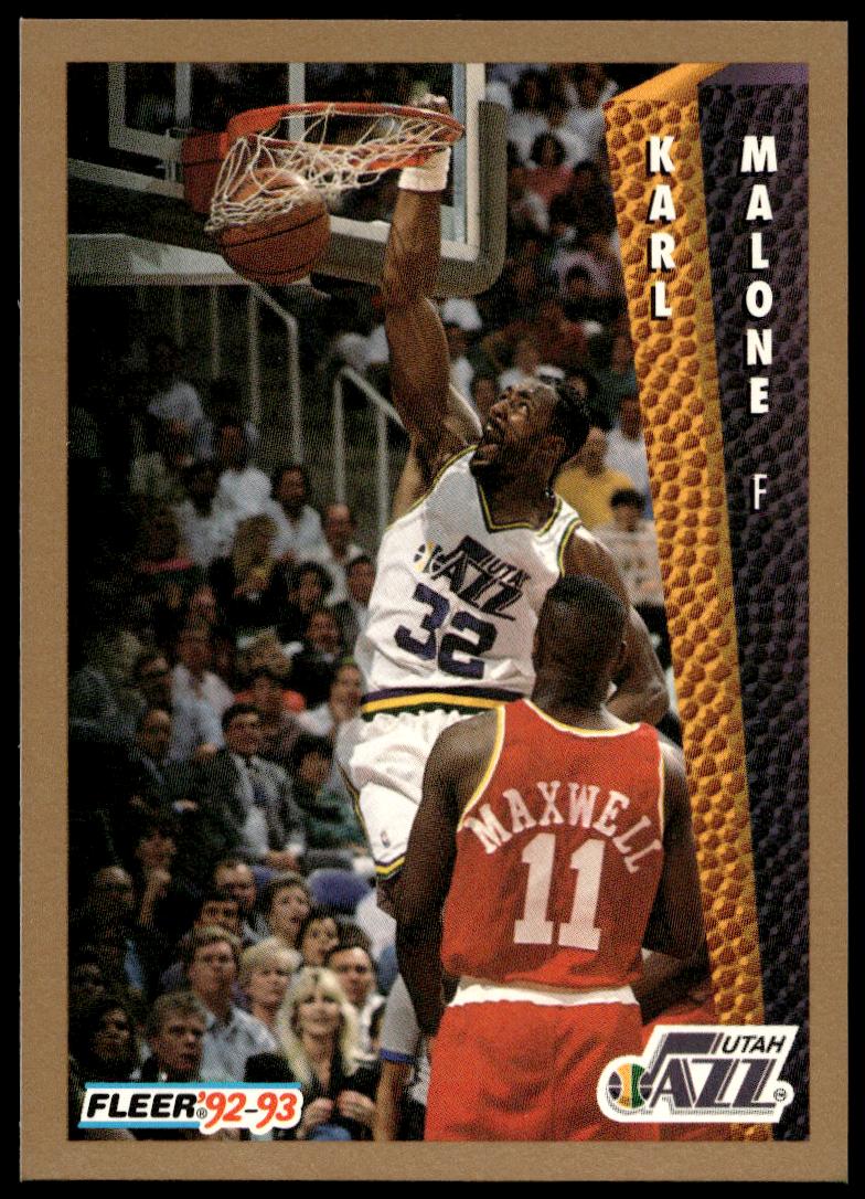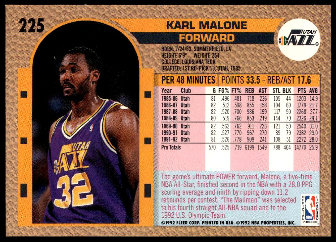 This Basketball card, from 1992-93 is part of the Fleer  card set. Karl Malone is featured and has a card number of 225.