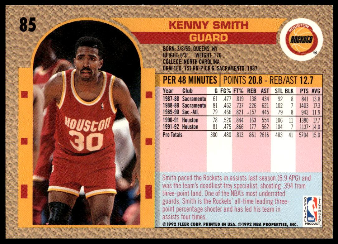 This Basketball card, from 1992-93 is part of the Fleer  card set. Kenny Smith is featured and has a card number of 85.