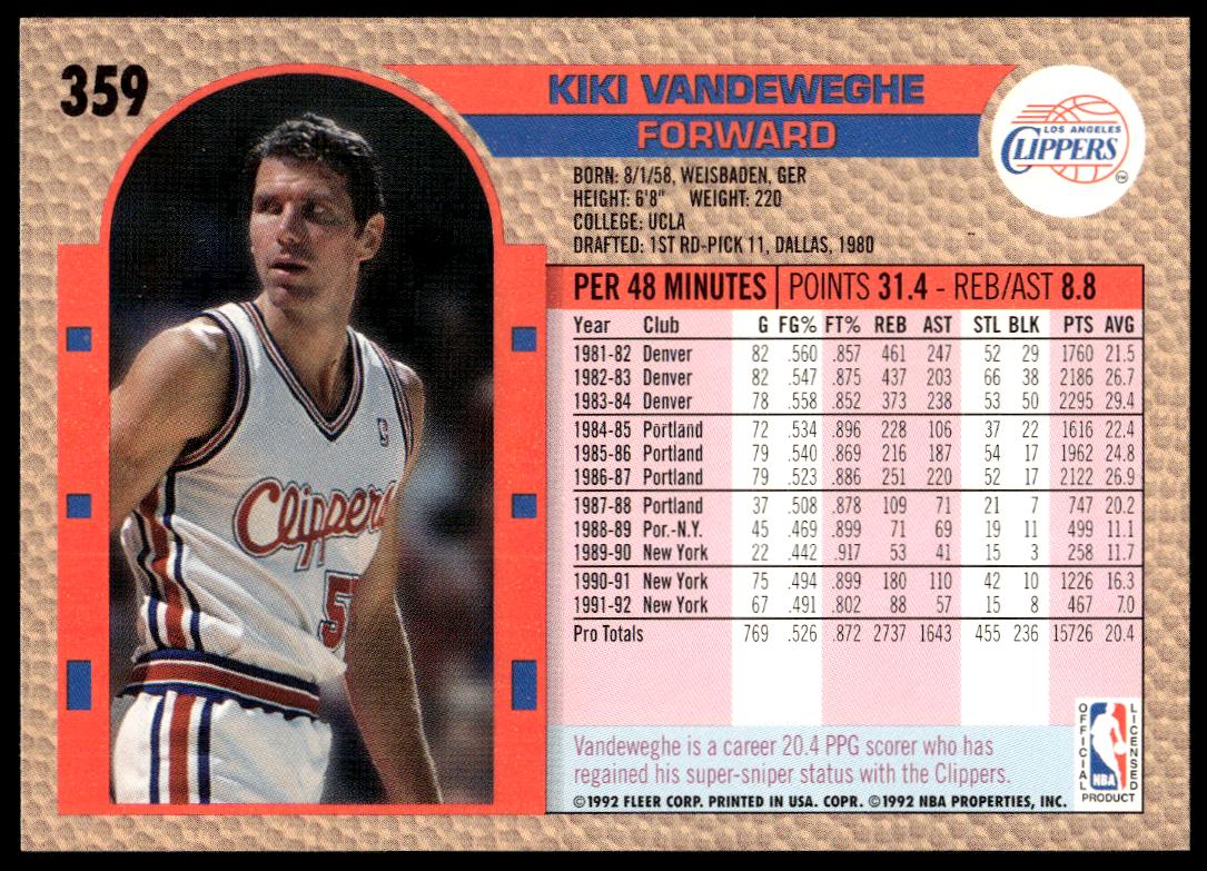 This Basketball card, from 1992-93 is part of the Fleer  card set. Kiki Vandeweghe is featured and has a card number of 359.