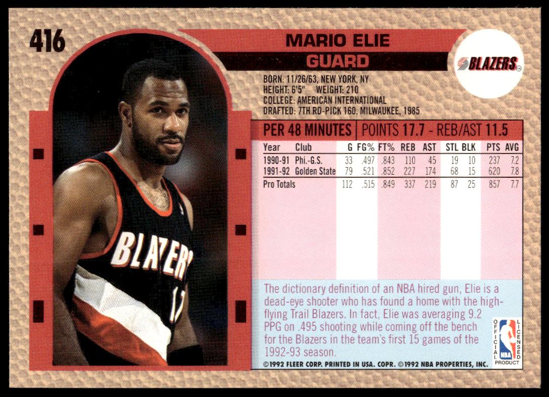 This Basketball card, from 1992-93 is part of the Fleer  card set. Mario Elie is featured and has a card number of 416.