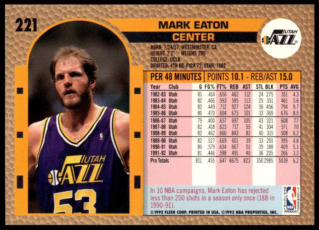 This Basketball card, from 1992-93 is part of the Fleer  card set. Mark Eaton is featured and has a card number of 221.