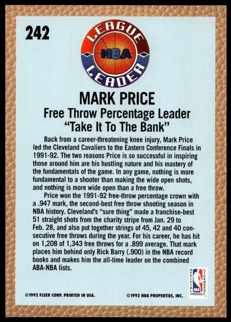 This Basketball card, from 1992-93 is part of the Fleer  card set. Mark Price is featured and has a card number of 242.