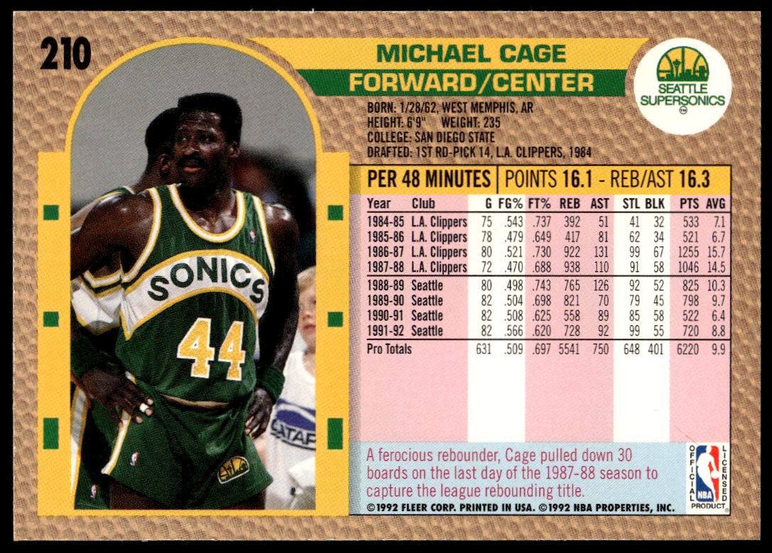 This BasketballΒ card, from 1992-93 is part of the Fleer Β card set. Michael Cage is featured and has a card number of 210.