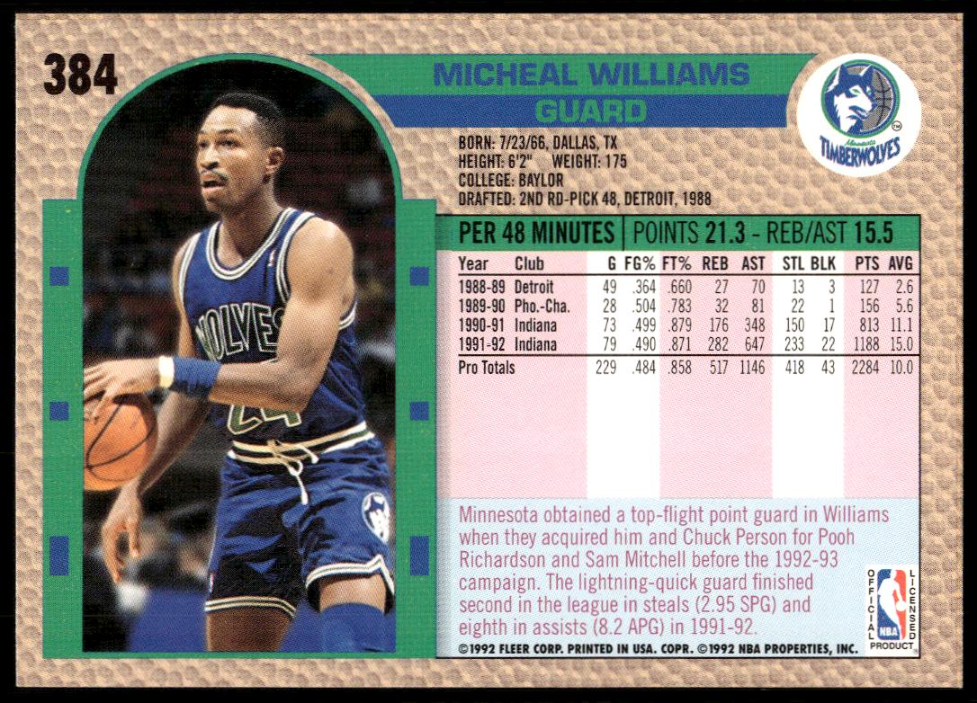 This Basketball card, from 1992-93 is part of the Fleer  card set. Micheal Williams is featured and has a card number of 384.
