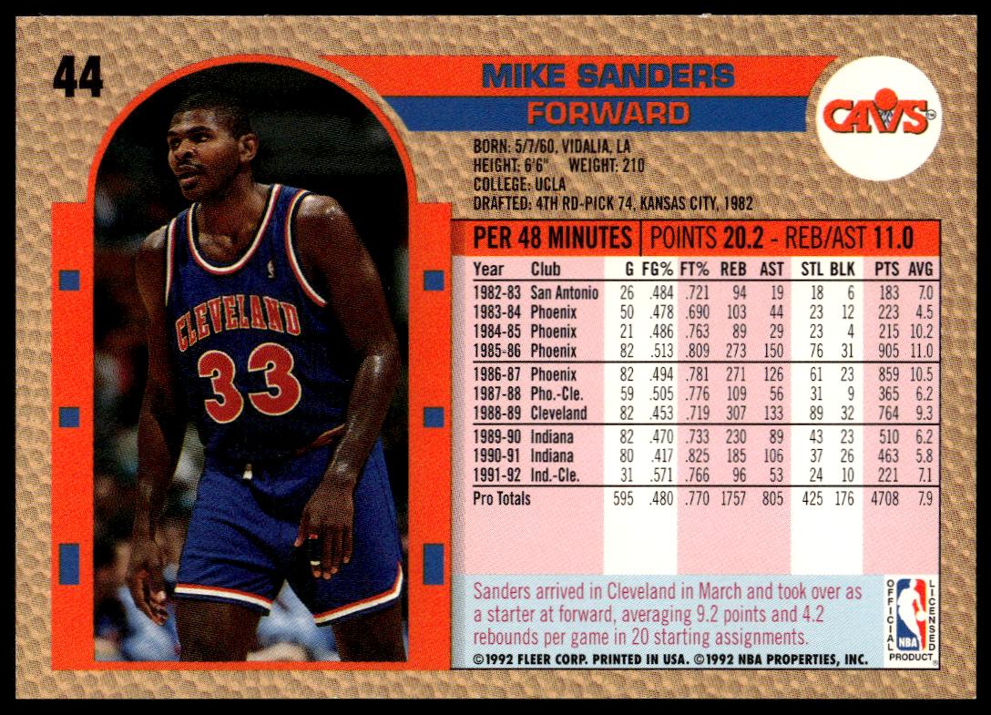 This Basketball card, from 1992-93 is part of the Fleer  card set. Mike Sanders is featured and has a card number of 44.