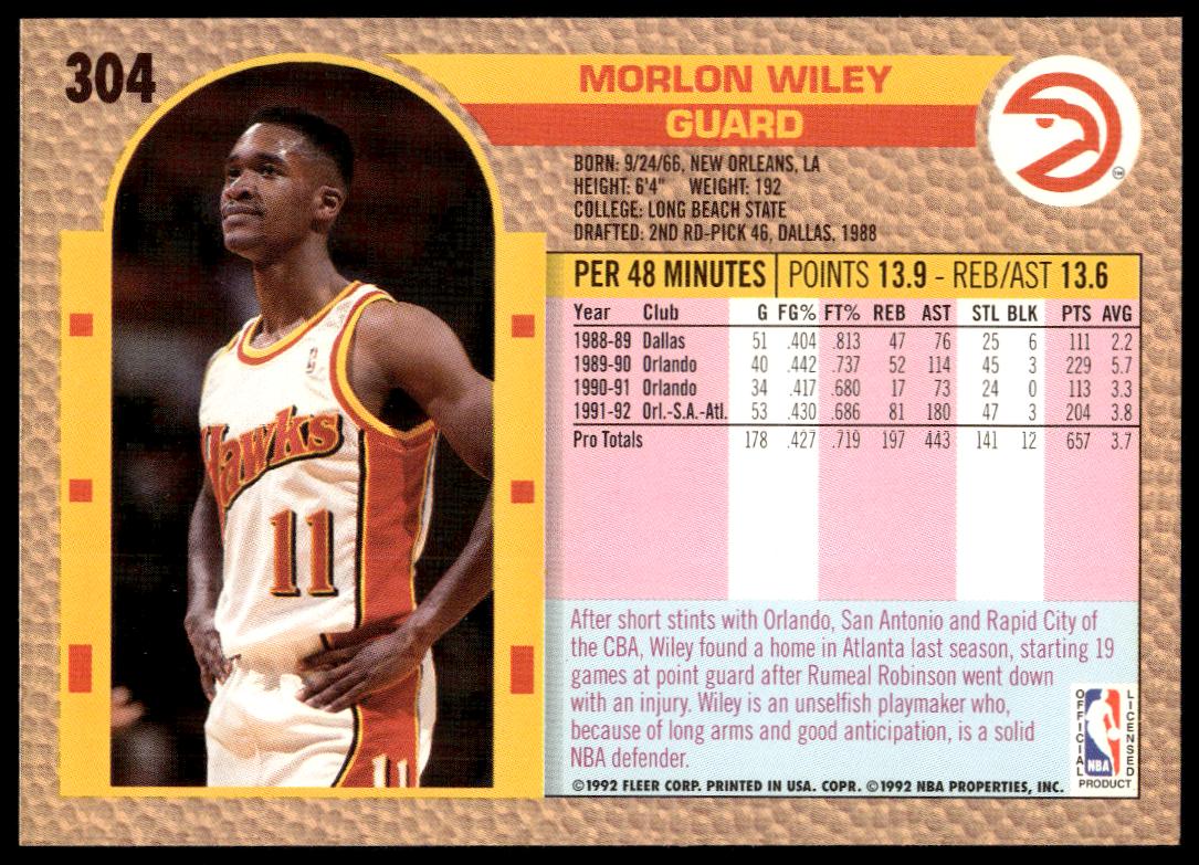 This Basketball card, from 1992-93 is part of the Fleer  card set. Morlon Wiley is featured and has a card number of 304.