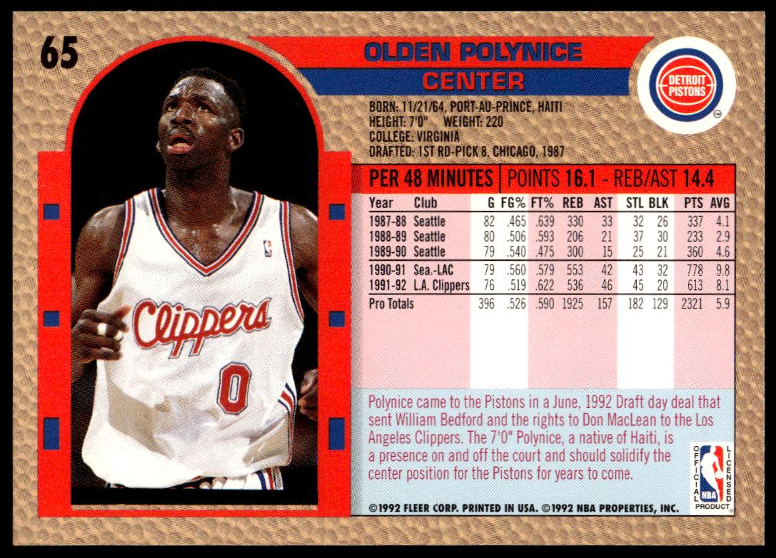 This Basketball card, from 1992-93 is part of the Fleer  card set. Olden Polynice is featured and has a card number of 65.
