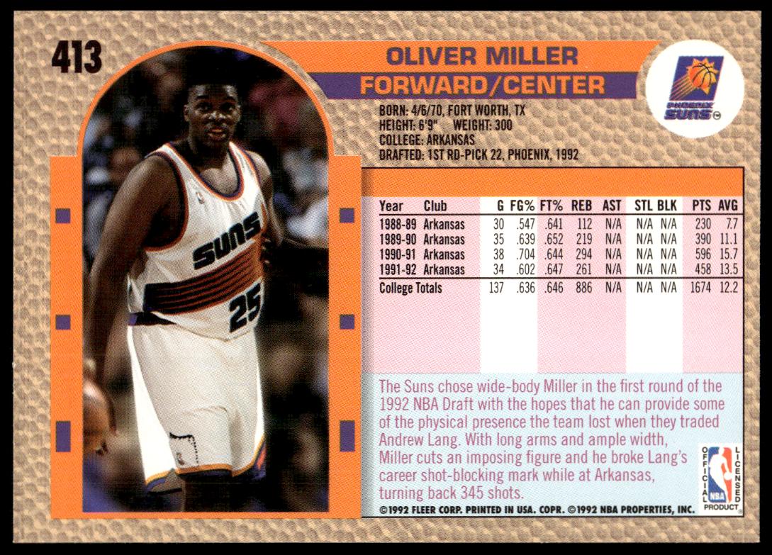 This Basketball card, from 1992-93 is part of the Fleer  card set. Oliver Miller is featured and has a card number of 413.