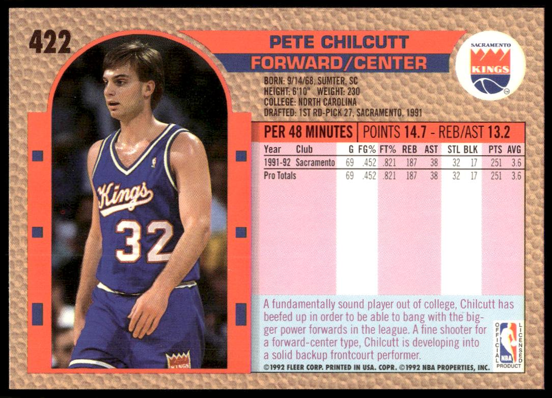 This Basketball card, from 1992-93 is part of the Fleer  card set. Pete Chilcutt is featured and has a card number of 422.