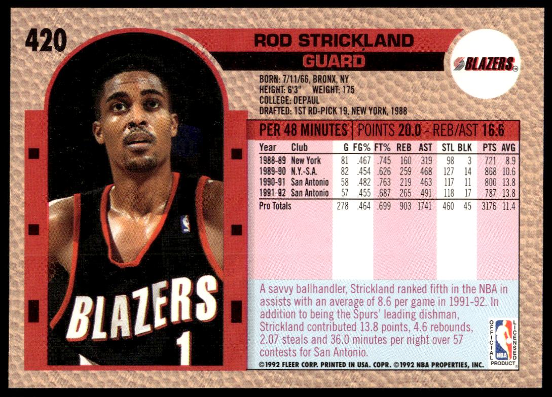 This Basketball card, from 1992-93 is part of the Fleer  card set. Rod Strickland is featured and has a card number of 420.