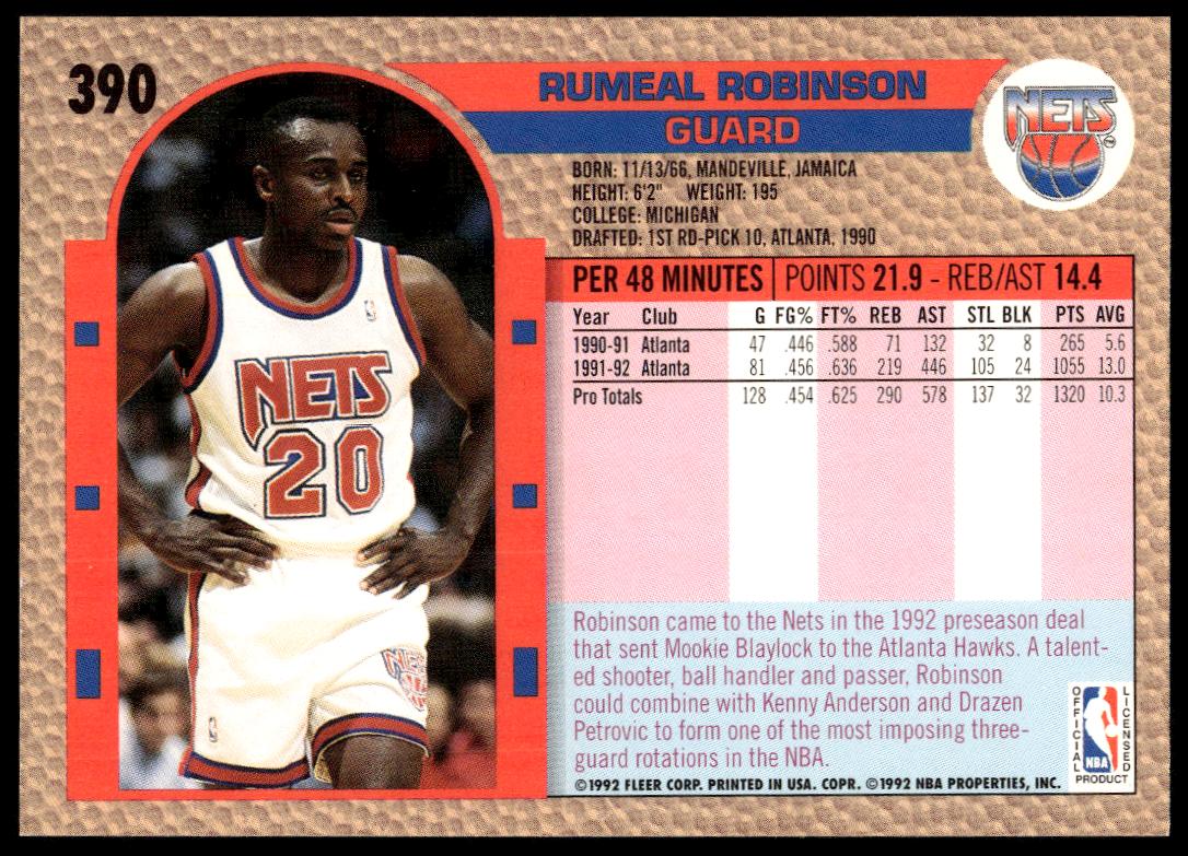 This BasketballΒ card, from 1992-93 is part of the Fleer Β card set. Rumeal Robinson is featured and has a card number of 390.