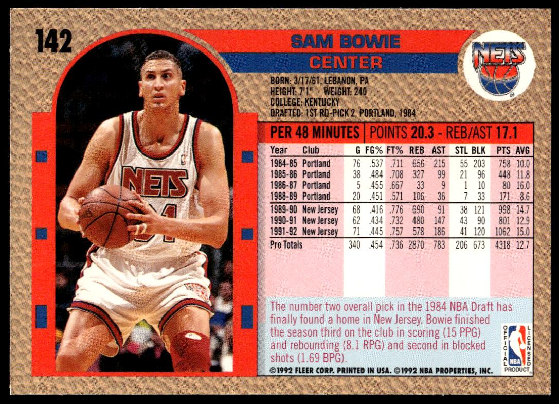This Basketball card, from 1992-93 is part of the Fleer  card set. Sam Bowie is featured and has a card number of 142.