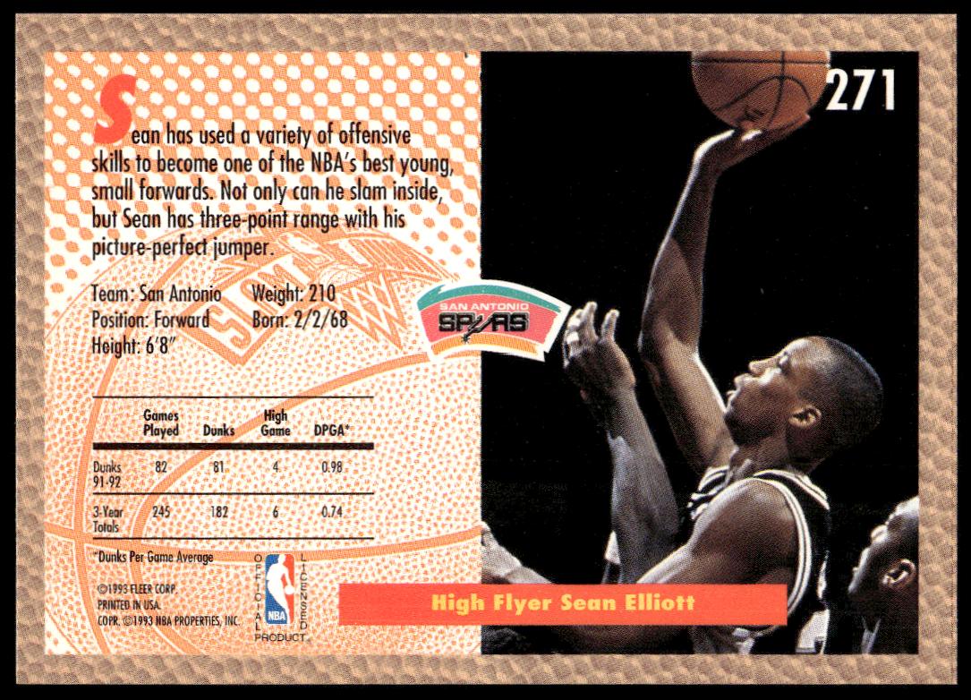 This Basketball card, from 1992-93 is part of the Fleer  card set. Sean Elliott is featured and has a card number of SD.