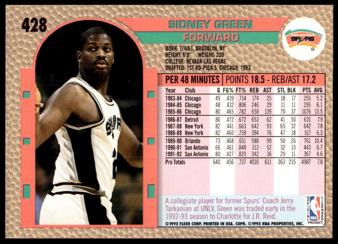 This Basketball card, from 1992-93 is part of the Fleer  card set. Sidney Green is featured and has a card number of 428.