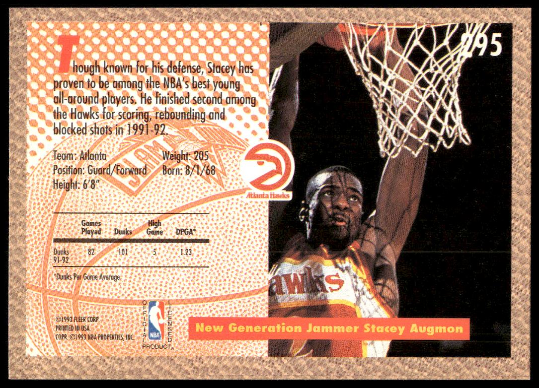 This Basketball card, from 1992-93 is part of the Fleer  card set. Stacey Augmon is featured and has a card number of 295.
