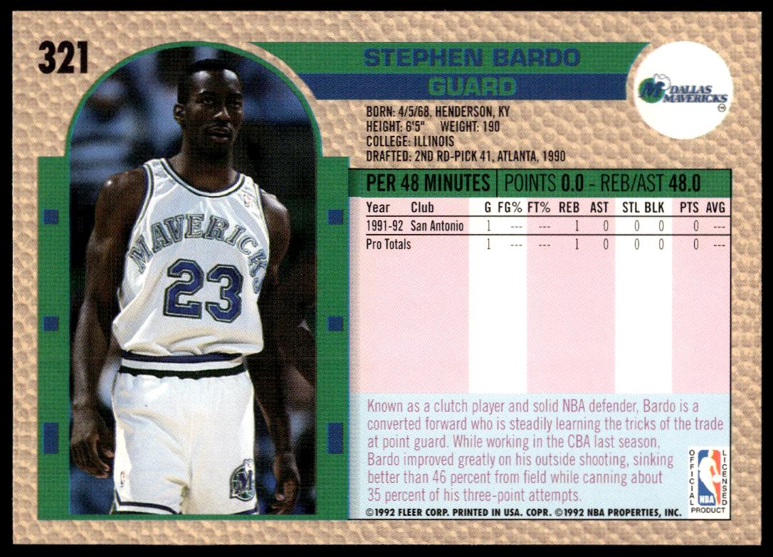 This Basketball card, from 1992-93 is part of the Fleer  card set. Steve Bardo is featured and has a card number of 321.