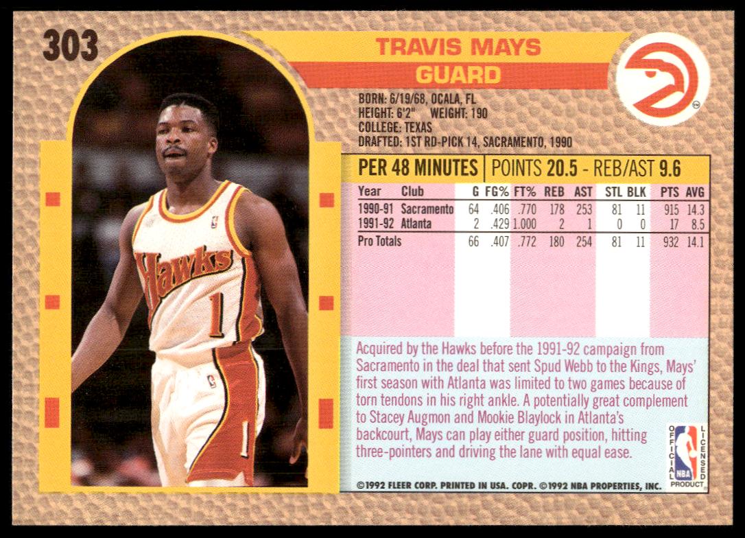 This Basketball card, from 1992-93 is part of the Fleer  card set. Travis Mays is featured and has a card number of 303.