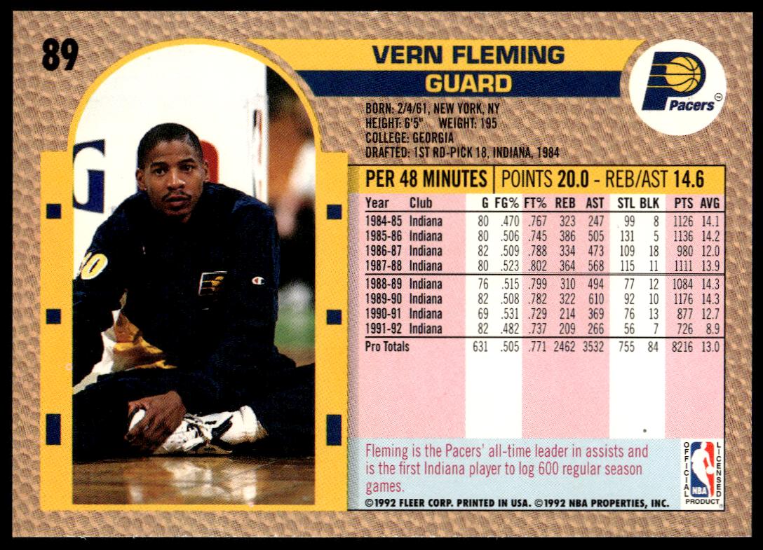 This Basketball card, from 1992-93 is part of the Fleer  card set. Vern Fleming is featured and has a card number of 89.