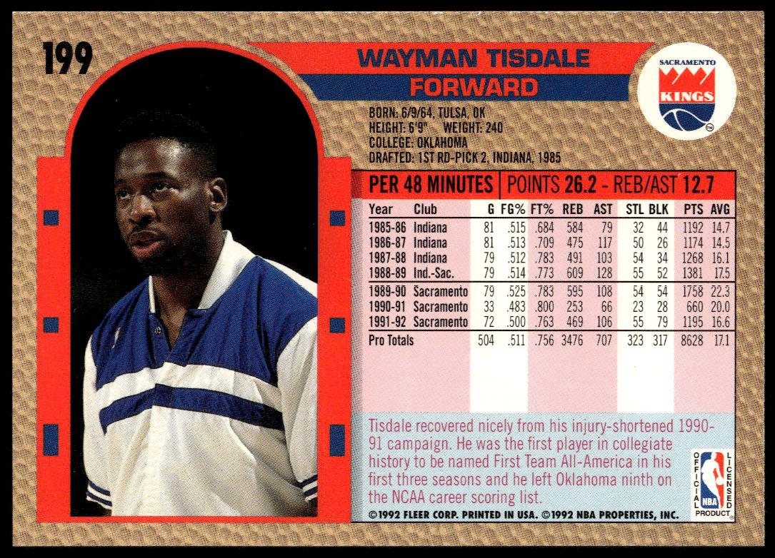 This BasketballΒ card, from 1992-93 is part of the Fleer Β card set. Wayman Tisdale is featured and has a card number of 199.