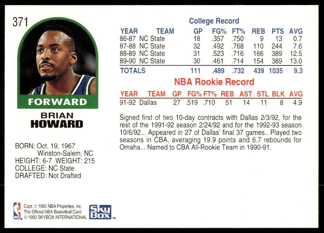 This Basketball card, from 1992-93 is part of the NBA Hoops card set. Brian Howard is featured and has a card number of 371.