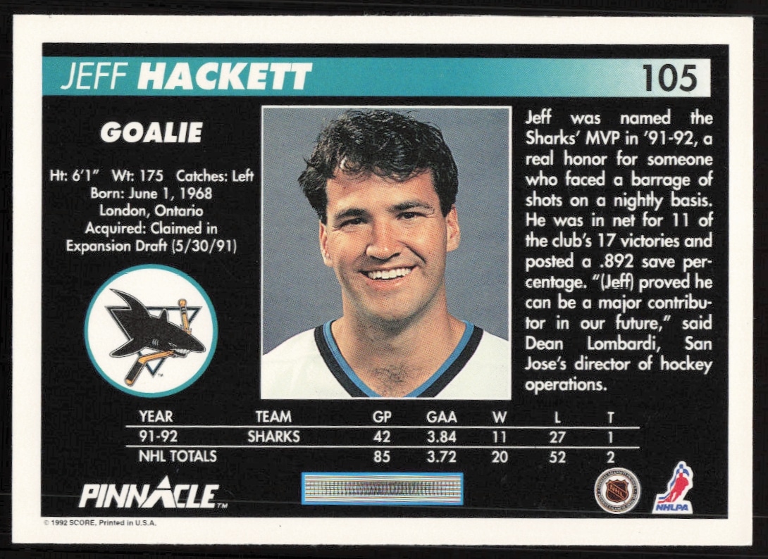 This Hockey card, from 1992-93 is part of the Pinnacle card set. Jeff Hackett is featured and has a card number of 105.