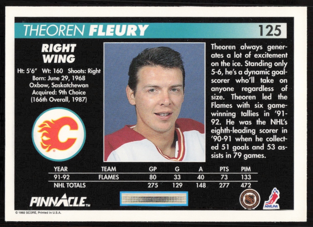 This Hockey card, from 1992-93 is part of the Pinnacle card set. Theoren Fleury is featured and has a card number of 125.