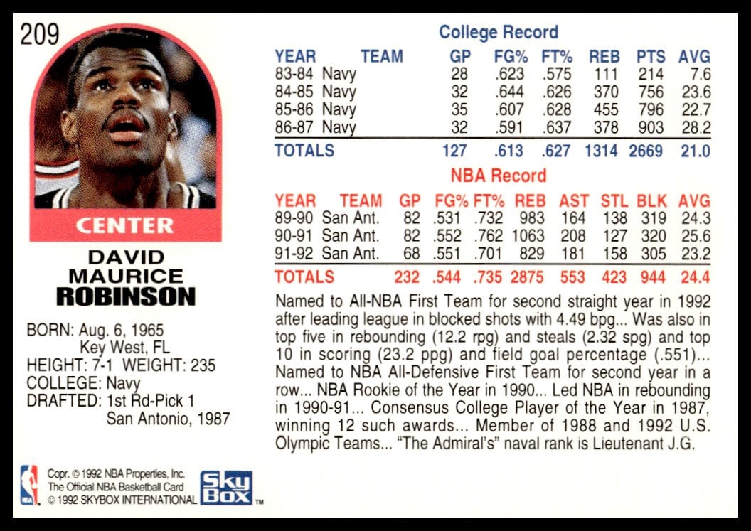 This Basketball card, from 1992-93 is part of the Hoops Series 1 card set. David Robinson is featured and has a card number of 209.