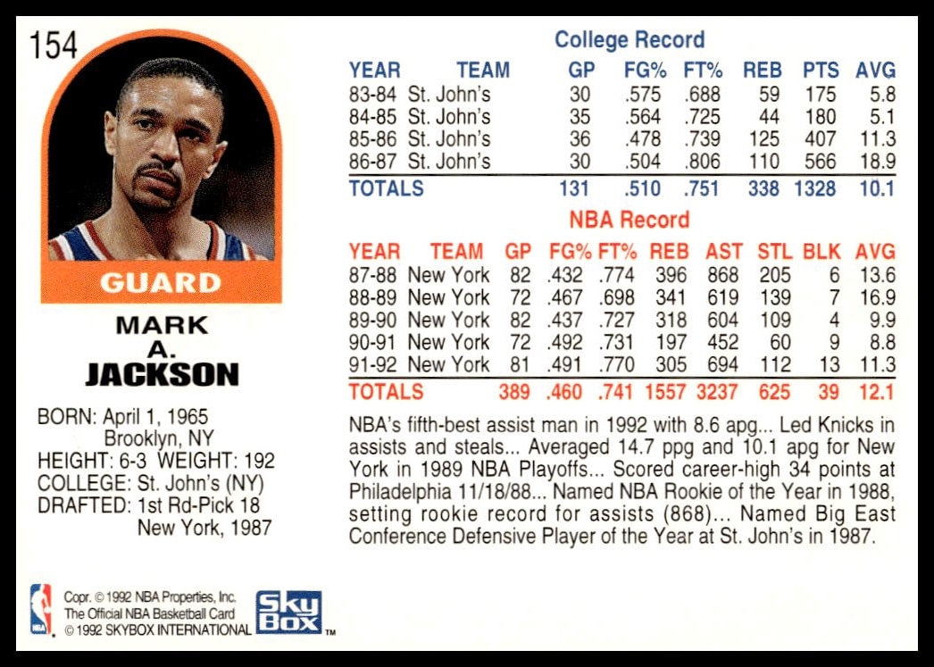 This Basketball card, from 1992-93 is part of the Hoops Series 1 card set. Mark Jackson is featured and has a card number of 154.