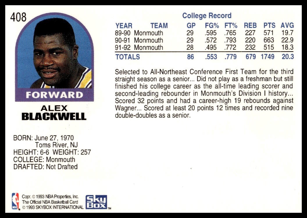 This Basketball card, from 1992-93 is part of the Hoops Series 2 card set. Alex Blackwell is featured and has a card number of 408.