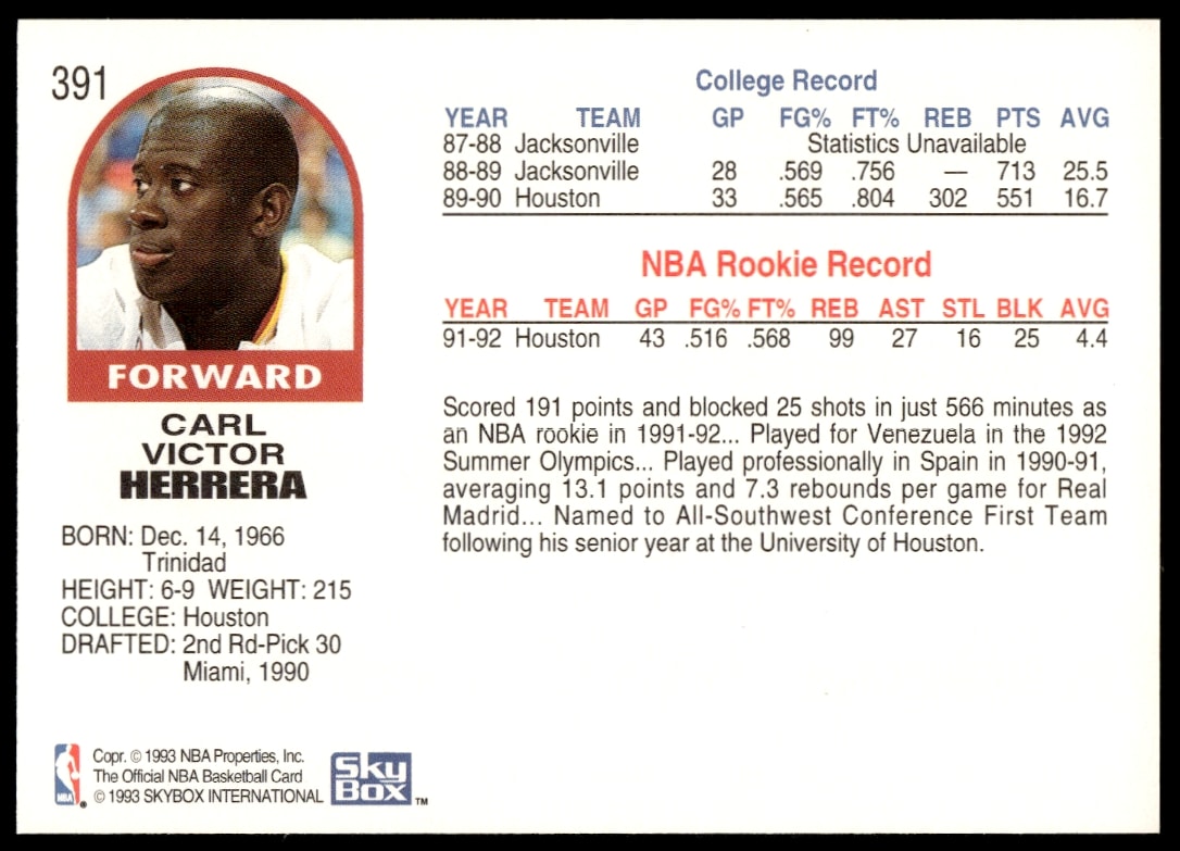 This Basketball card, from 1992-93 is part of the NBA Hoops card set. Carl Herrera is featured and has a card number of 391.
