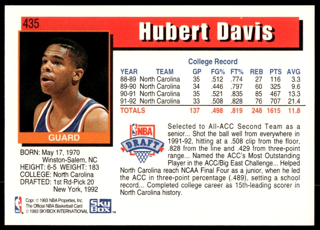 This Basketball card, from 1992-93 is part of the NBA Hoops card set. Hubert Davis is featured and has a card number of 435.
