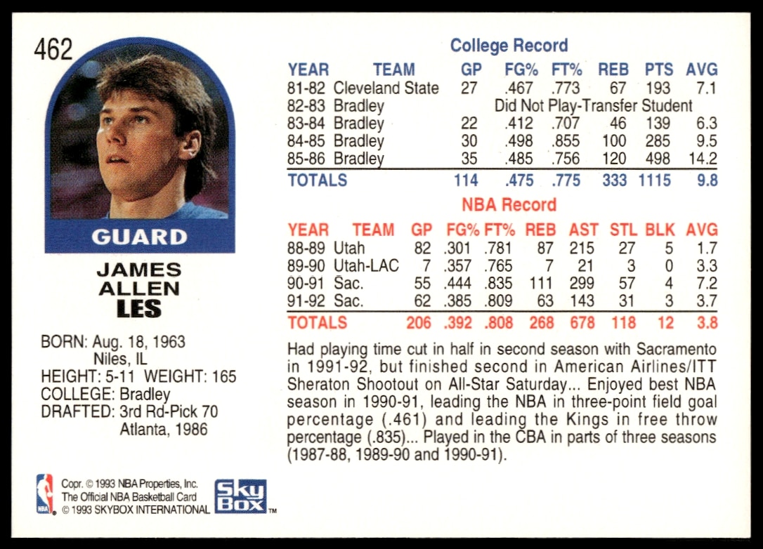 This Basketball card, from 1992-93 is part of the NBA Hoops card set. Jim Les is featured and has a card number of 462.