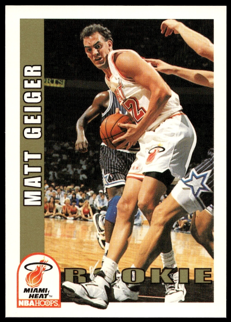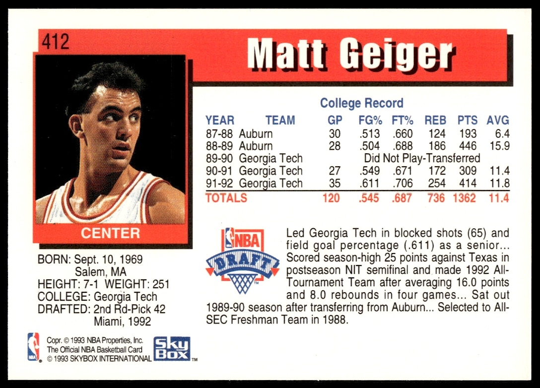 This Basketball card, from 1992-93 is part of the NBA Hoops card set. Matt Geiger is featured and has a card number of 412.