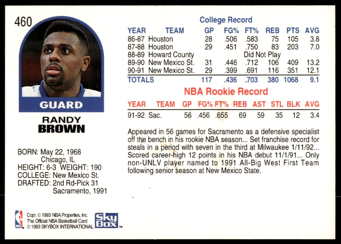 This Basketball card, from 1992-93 is part of the NBA Hoops card set. Randy Brown is featured and has a card number of 460.