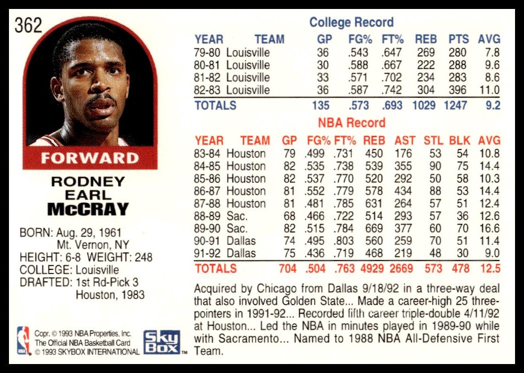 This BasketballΒ card, from 1992-93 is part of the Hoops Series 2Β card set. Rodney McCray is featured and has a card number of 362.