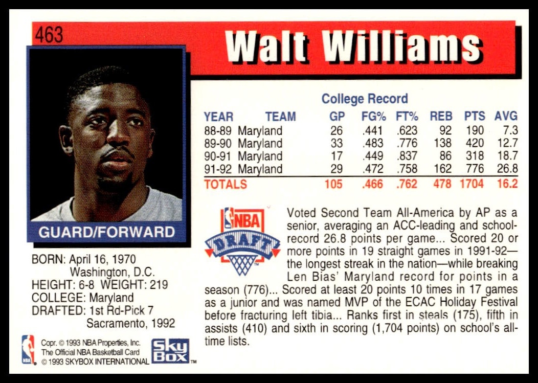 This BasketballΒ card, from 1992-93 is part of the Hoops Series 2Β card set. Walt Williams is featured and has a card number of 463.