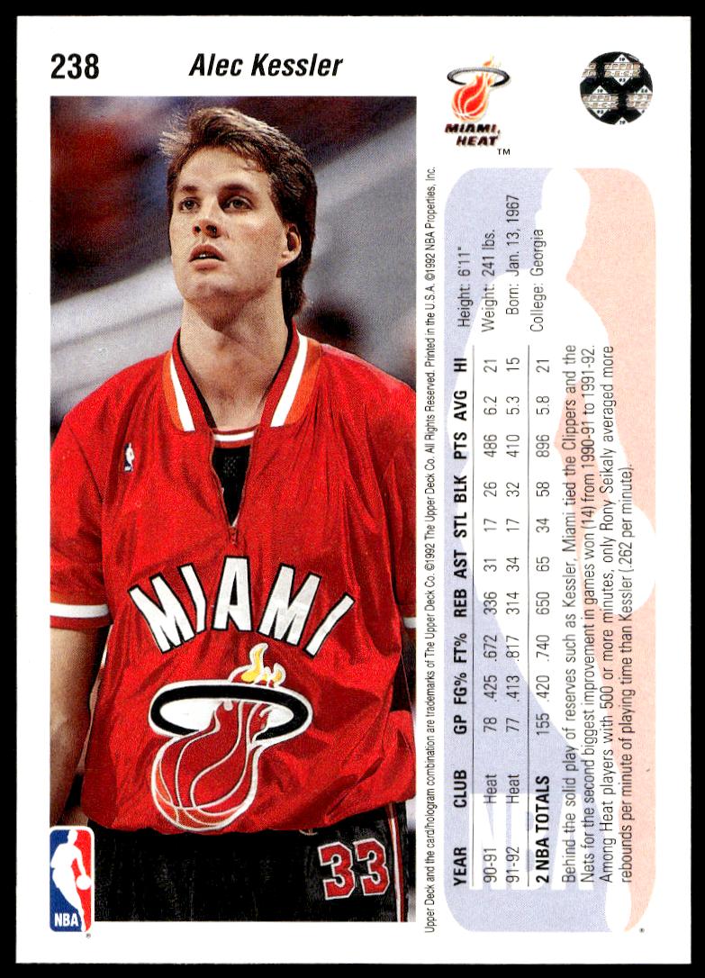 This BasketballΒ card, from 1992-93 is part of the Upper Deck Β card set. Alec Kessler is featured and has a card number of 238.