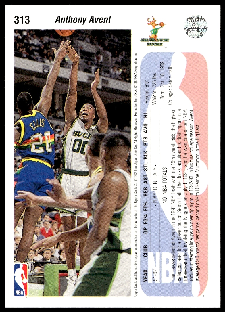 This Basketball card, from 1992-93 is part of the Upper Deck  card set. Anthony Avent is featured and has a card number of 313.