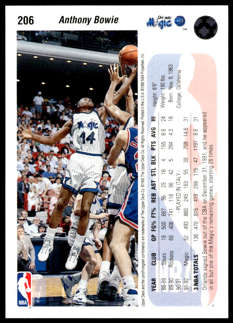 This BasketballΒ card, from 1992-93 is part of the Upper Deck Β card set. Anthony Bowie is featured and has a card number of 206.