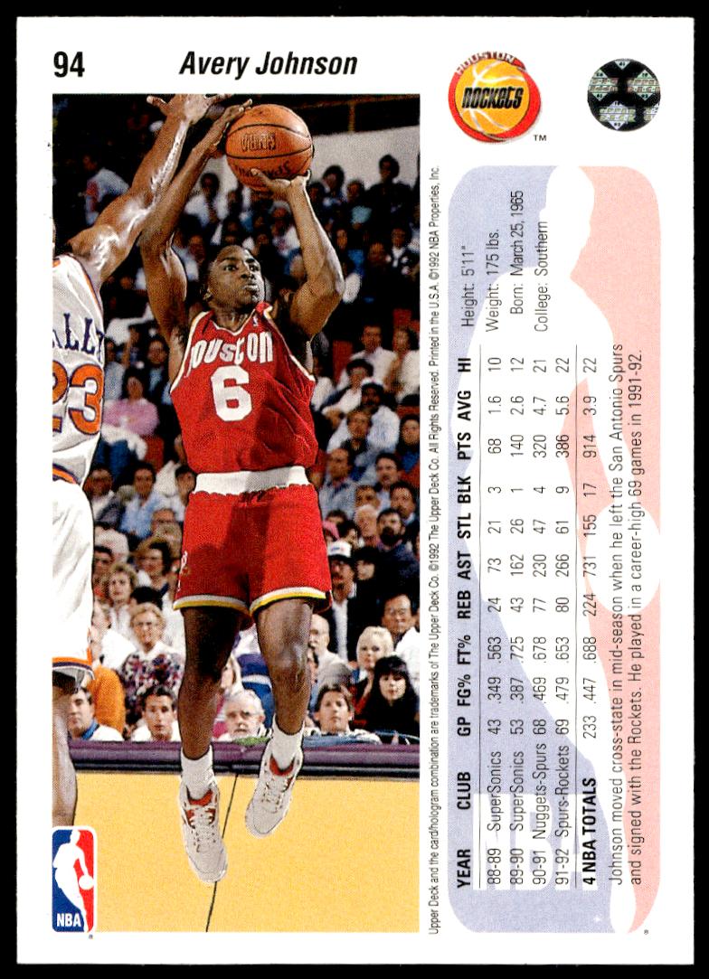 This BasketballΒ card, from 1992-93 is part of the Upper Deck Β card set. Avery Johnson is featured and has a card number of 94.