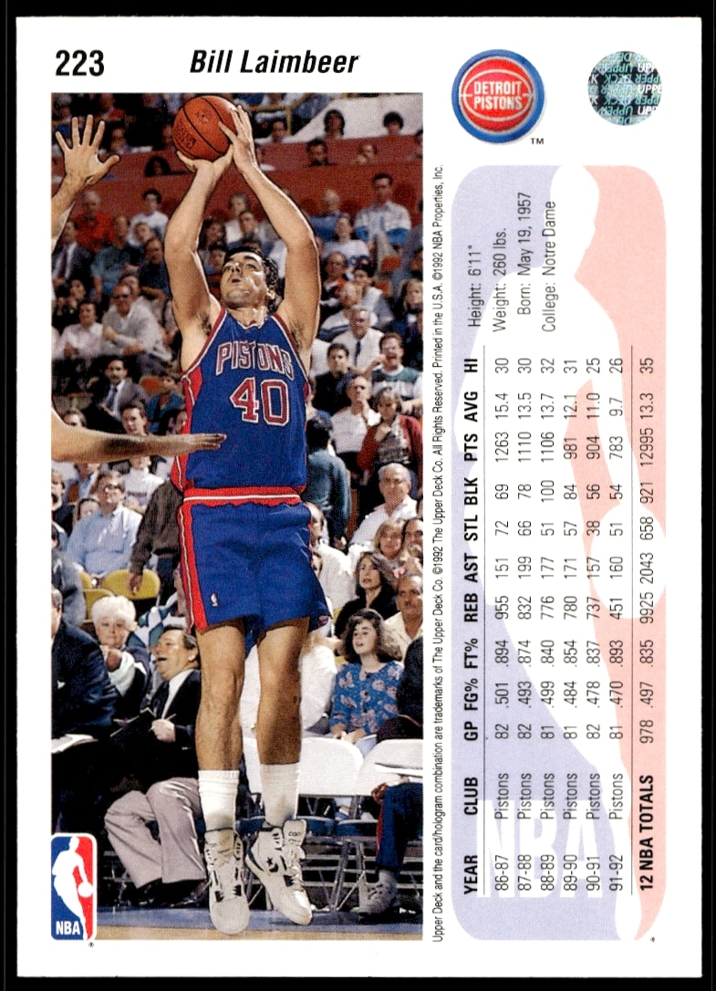 This Basketball card, from 1992-93 is part of the Upper Deck  card set. Bill Laimbeer is featured and has a card number of 223.