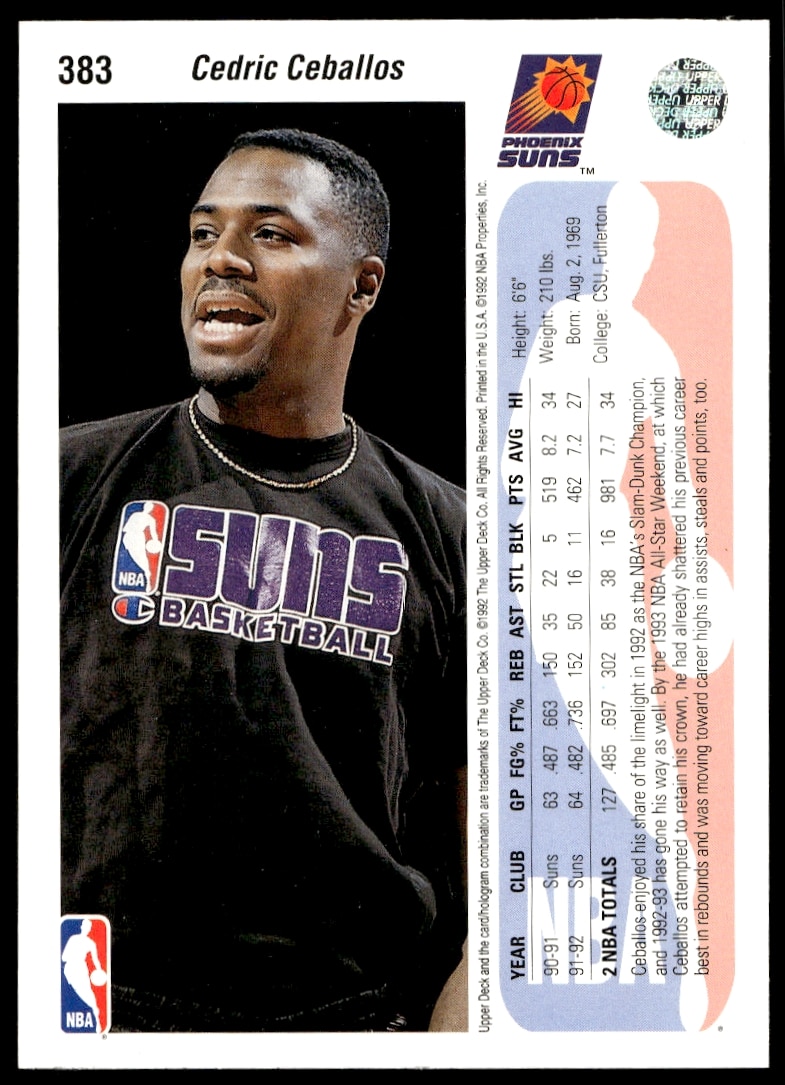 This BasketballΒ card, from 1992-93 is part of the Upper Deck Β card set. Cedric Ceballos is featured and has a card number of 383.