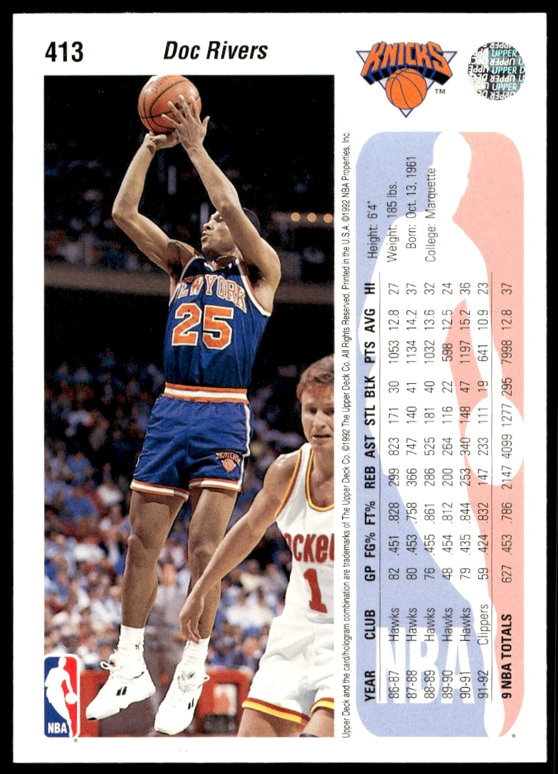 This Basketball card, from 1992-93 is part of the Upper Deck  card set. Doc Rivers is featured and has a card number of 413.
