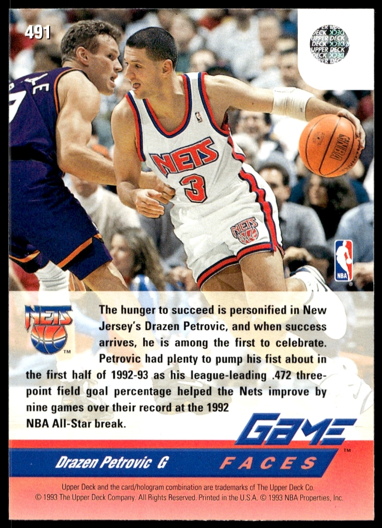 This Basketball card, from 1992-93 is part of the Upper Deck  card set. Drazen Petrovic is featured and has a card number of 491.
