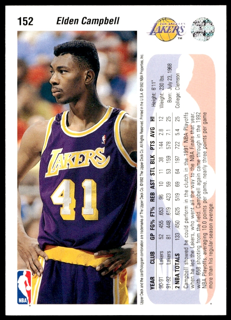 This Basketball card, from 1992-93 is part of the Upper Deck  card set. Elden Campbell is featured and has a card number of 152.