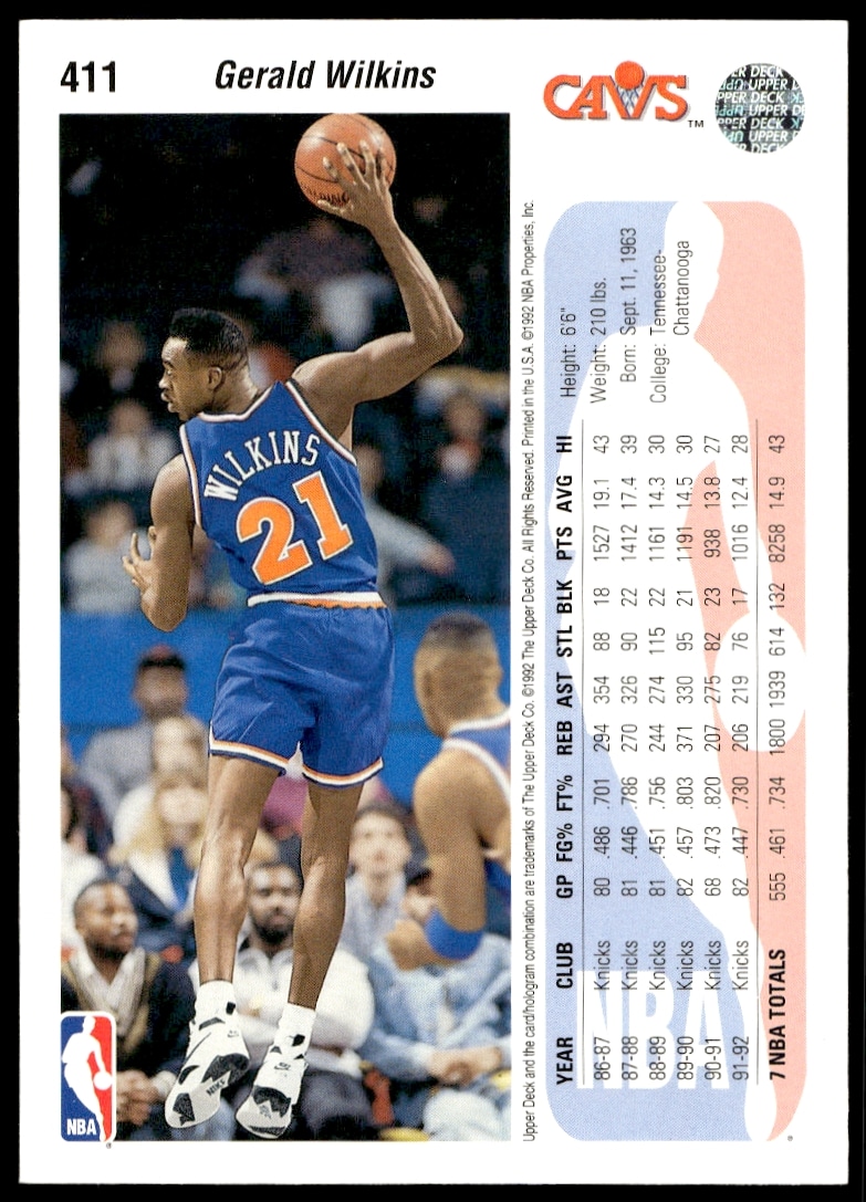 This BasketballΒ card, from 1992-93 is part of the Upper Deck Β card set. Gerald Wilkins is featured and has a card number of 411.